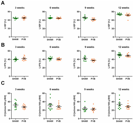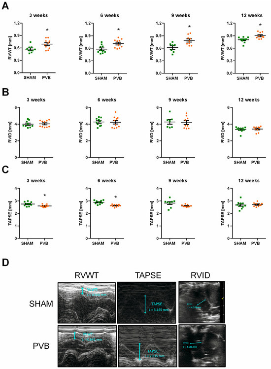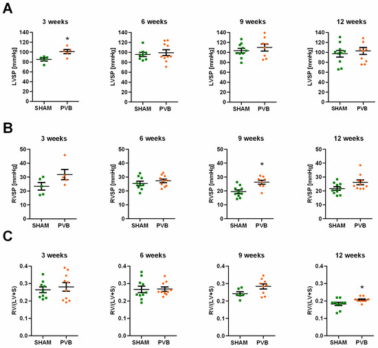 In vivo hemodynamic measurements were performed in separate groups at various time points after PVB (3, 6, 9, and 12 weeks). Rats were anesthetized using isoflurane (3% v/v) and placed on a controlled heating table, and the core temperature, measured via rectal probe, was maintained at 37 °C. Left ventricular systolic pressure (LVSP) was measured by catheterizing the left ventricle via the right carotid artery. Right jugular vein access was used for RV catheterization to measure RV systolic pressure (RVSP). Hemodynamic measurements were performed using a 2F Mikro-Tip® catheter (SPR-320, Millar Instruments, Houston, TX, USA) and a PowerLab 8/30 System with Chart 7.0 software (AD Instruments GmbH, Spechbach, Germany). Immediately after the completion of the hemodynamic measurements, the rats were exsanguinated under deep isoflurane anesthesia (5% v/v, Isofluran Baxter®, Baxter Deutschland GmbH, Unterschleißheim, Germany), and blood samples were collected.