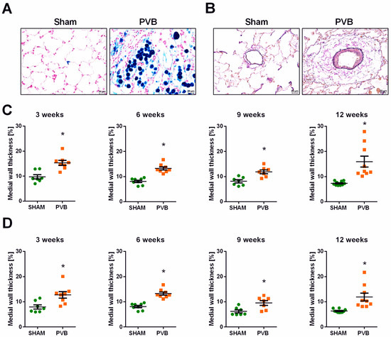 19]. These findings suggested that PVB in rats might be a suitable model for PH-LHD. However, due to the lack of studies, the exact order and timing of the functional, hemodynamic, and histologic events that underlie pulmonary vascular remodeling processes in this model remain unknown.