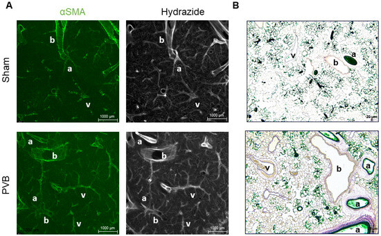 The agarose-embedded lungs were cut into 350 µm thick sections. Endogenous peroxidase activity was quenched through the incubation of sections in 5% hydrogen peroxide in MeOH overnight at room temperature. Unspecific binding was blocked using blocking buffer (BSA in PBS + Triton-X-100 + goat serum) for 2 × 1 h under constant agitation. Afterward, sections were incubated with anti-α-smooth muscle actin antibodies (anti-SMA-Cy3, #C6198, Clone 1A4, Sigma-Aldrich (St. Louis, MO, USA), 1:250 dilution, and anti-SMA-488, #C6198, Clone 1A4, Sigma-Aldrich, 1:250 dilution) and hydrazide-633 (Alexa Fluor 633 Hydrazide bis(triethylammonium) salt, #A30634, Invitrogen (Waltham, MA, USA), 1:500 dilution) in blocking buffer for 3 days at 4 °C under constant shaking. Unbound antibodies were then removed by washing sections five times for 1 h with washing buffer (PBS + Triton-X-100 + goat serum) at room temperature. In the following steps, the sections were post-fixed in 4% formalin for 1 h at 4 °C and washed 2 times with PBS for 20 min. Then, sections were dehydrated, followed by clearing of the tissue with BABB (Benzyl-Alcohol-Benzyl-Benzoate, 1:1, Sigma-Aldrich, #305197, Sigma B6630). Tissue sections were examined using a fluorescence stereomicroscope M205 FCA coupled to DFC9000 GT camera (Leica, Wetzlar, Germany).