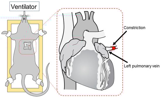®, Baxter Deutschland GmbH, Unterschleißheim, Germany). Following orotracheal intubation with a 16G cannula (B. Braun Melsungen, Melsungen, Germany), the animals were placed on a heating pad to maintain body temperature, and the intubation tube was connected to a rodent ventilator (SAR 830/P, IITC Life Science Inc., Woodland Hills, CA, USA). The animals were positioned on their right side, and the thorax was shaved. Then, a left lateral thoracotomy in the third intercostal space was performed to gain access to the pulmonary vein. The pulmonary vein was fully ligated or partially ligated to a size of 0.8 or 0.6 mm using silk threads (Seraflex