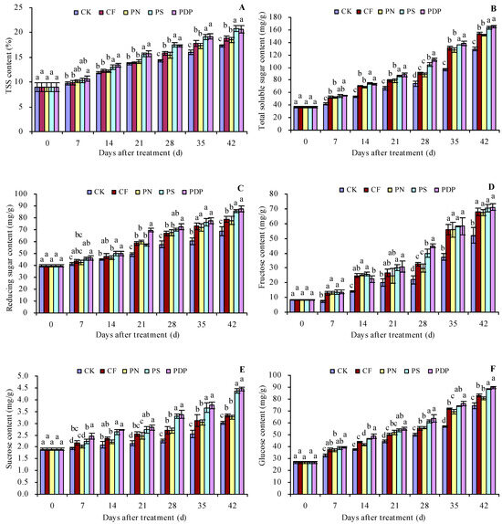 As the number of days after treatment increased, the total soluble solids (TSSs), total soluble sugar, reducing sugar, fructose, sucrose, and glucose content increased in the grape fruits (Figure 1A–F). Potassium sulfate (PS) and potassium dihydrogen phosphate (PDP) increased the TSS content to some extent on all the sampled days after treatment, while complex fertilizer (CF) and potassium nitrate (PN) only increased on the 28th, 35th, and 42nd days after treatment. CF, PN, PS, and PDP increased the total soluble sugar, reducing sugar, fructose, sucrose, and glucose content on all days following treatment, to some extent. On the 42nd day after treatment, the order of the TSS and total soluble sugar content was PDP ≈ PS > PN ≈ CF > control (CK). CK, CF, PN, PS, and PDP increased the TSS content by 1.5, 1.2, 3.5, and 3.4 percentage points and the total soluble sugar content by 19.4%, 17.0%, 26.3%, and 27.8%, respectively, on the 42nd day after treatment.