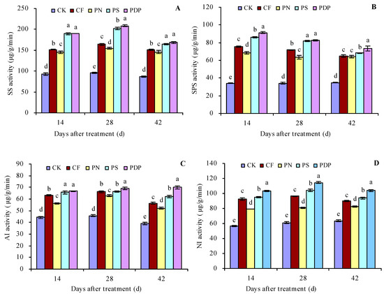 According to the changes in sugar content in the grape fruits, the 14th, 28th, and 42nd days after treatment were chosen for the sugar metabolism-related enzyme activity measurement in the grape fruits (Figure 2A–D). CF, PN, PS, and PDP increased the activity of SS, SPS, AI, and NI in the grape fruits on the 14th, 28th, and 42nd days after treatment. On the 42nd day after treatment, CF, PN, PS, and PDP increased SS activity by 73.8%, 68.1%, 89.6%, and 94.1%, SPS activity by 85.4%, 83.5%, 95.6%, and 110.1%, NI activity by 44.1%, 33.5%, 59.1%, and 79.2%, and SPS activity by 41.8%, 30.1%, 47.9%, and 63.9%, respectively, compared to CK.