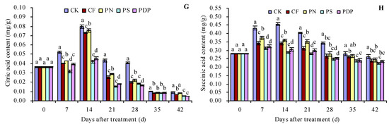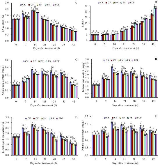 As the number of days after treatment increased, the titratable acid (TA), oxalic acid, tartaric acid, L-malic acid, D-malic acid, citric acid, and succinic acid content in the grape fruits increased until the 14th day and decreased thereafter (Figure 3A,C–H). The organic acid content of the different compounds also peaked on the 14th day after treatment. CF, PN, PS, and PDP decreased the TSS content to some extent on all days after treatment. On the 14th (and later days) after treatment, CF, PN, PS, and PDP decreased the oxalic acid, tartaric acid, L-malic acid, D-malic acid, citric acid, and succinic acid content to some extent. On the 42nd day after treatment, the order of TA content was CK > CF ≈ PN > PS ≈ PDP. CK, CF, PN, PS, and PDP decreased the TA content by 0.09, 0.06, 0.18, and 0.17 percentage points, respectively, on the 42nd day after treatment. As the number of days after treatment increased, the TSS/TA ratio of the grape fruits also displayed an increasing trend (Figure 3B). CF, PN, PS, and PDP increased the TSS/TA ratio to some extent on all days after treatment. On the 42nd day after treatment, the order of the TSS/TA ratio was PS ≈ PDP > CF ≈ PN > CK.