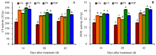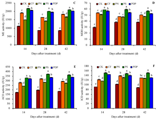 The organic acid metabolism-related enzyme activity in the grape fruits was measured on the 14th, 28th, and 42nd days after treatment because of the changes observed in the organic acid content in grape fruits on those days (Figure 4A–F). CF, PN, PS, and PDP increased the activity of citrate synthetase (CS), PEPC, ME, MDH, aconitase (ACO), and isocitrate dehydrogenase (ICD) in the grape fruits on the 14th, 28th, and 42nd days after treatment. On the 42nd day after treatment, CF, PN, PS, and PDP increased CS activity by 21.2%, 19.1%, 51.2%, and 29.1%, PEPC activity by 46.9%, 37.6%, 68.0%, 62.2%, ME activity by 114.1%, 94.5%, 144.8%, and 135.4%, MDH activity by 31.6%, 24.7%, 48.3%, and 36.3%, ACO activity by 58.5%, 47.5%, 95.2%, and 82.4%, and ICD activity by 47.8%, 46.0%, 71.8%, and 48.9%, respectively, compared to CK.