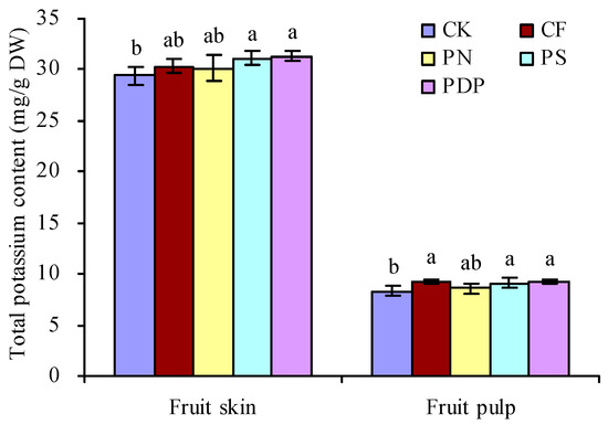The total potassium content in grape fruits on the 42nd day after treatment was determined (Figure 5). CF, PN, PS, and PDP increased the total potassium content in the skin and pulp of grape fruits to a certain degree. PS and PDP significantly increased the total potassium content in skin and pulp. CF and PN had no significant effects on the total potassium content in the skin. CF significantly increased the total potassium content in pulp, while PN had no significant effects on this parameter.