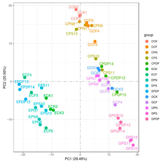Principal component analysis among treatments. CCK, CCF, CPN, CPS, and CPDP represent the control, complex fertilizer, potassium nitrate, potassium sulfate, and potassium dihydrogen phosphate, respectively, at 14 days after treatment. ECK, ECF, EPN, EPS, and EPDP represent the control, complex fertilizer, potassium nitrate, potassium sulfate, and potassium dihydrogen phosphate, respectively, at 28 days after treatment. GCK, GCF, GPN, GPS, and GPDP represent the control, complex fertilizer, potassium nitrate, potassium sulfate, and potassium dihydrogen phosphate, respectively, at 42 days after treatment.