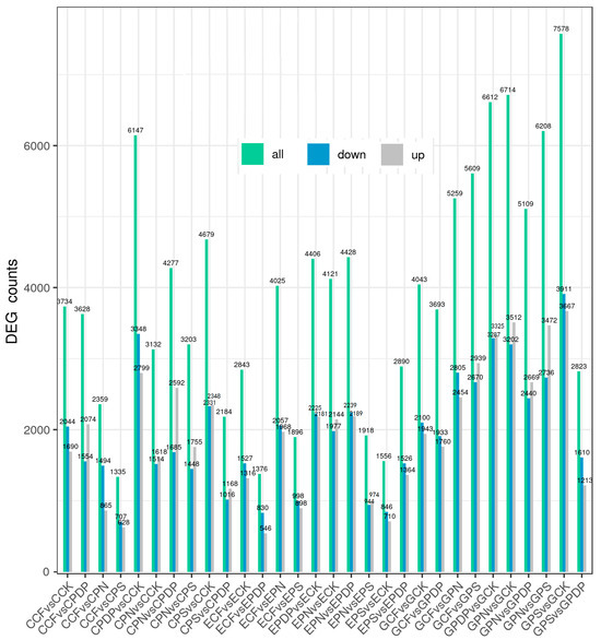 Total numbers of DEGs, upregulated genes, and downregulated genes. CCK, CCF, CPN, CPS, and CPDP represent the control, complex fertilizer, potassium nitrate, potassium sulfate, and potassium dihydrogen phosphate, respectively, at 14 days after treatment. ECK, ECF, EPN, EPS, and EPDP represent the control, complex fertilizer, potassium nitrate, potassium sulfate, and potassium dihydrogen phosphate, respectively, at 28 days after treatment. GCK, GCF, GPN, GPS, and GPDP represent the control, complex fertilizer, potassium nitrate, potassium sulfate, and potassium dihydrogen phosphate, respectively, at 42 days after treatment.