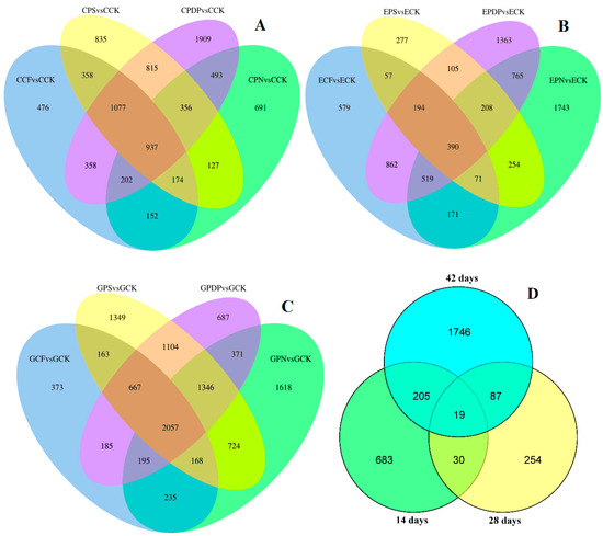 Venn diagram of DEGs. (A) DEGs of four treatments at 14 days after treatment; (B) DEGs of four treatments at 28 days after treatment; (C) DEGs of four treatments at 42 days after treatment. (D) DEGs of three periods. CCK, CCF, CPN, CPS, and CPDP represent the control, complex fertilizer, potassium nitrate, potassium sulfate, and potassium dihydrogen phosphate, respectively, at 14 days after treatment. ECK, ECF, EPN, EPS, and EPDP represent the control, complex fertilizer, potassium nitrate, potassium sulfate, and potassium dihydrogen phosphate, respectively, at 28 days after treatment. GCK, GCF, GPN, GPS, and GPDP represent the control, complex fertilizer, potassium nitrate, potassium sulfate, and potassium dihydrogen phosphate, respectively, at 42 days after treatment.