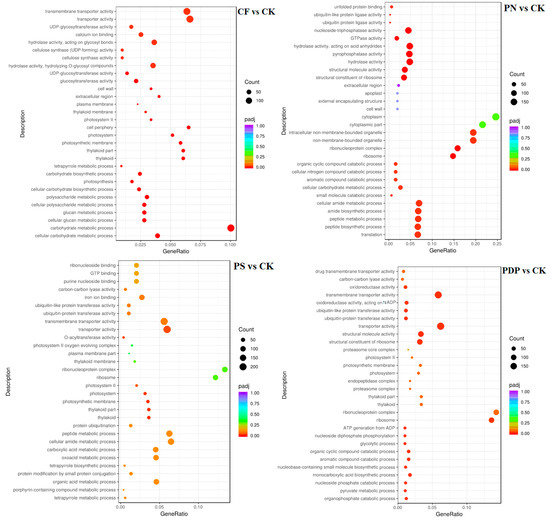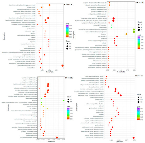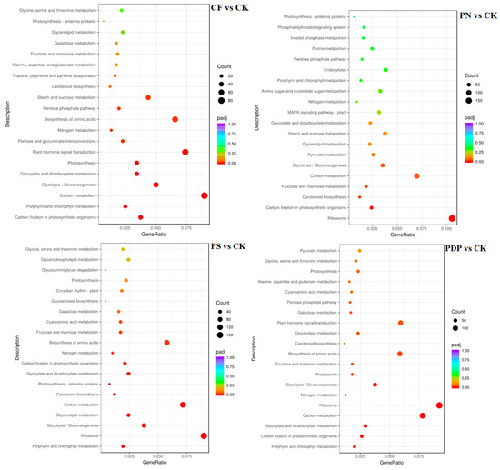 The GO enrichment analysis revealed that the DEGs from the 14th day after treatment were involved in biological processes, cellular components, and molecular functions (Figure 9). Among the biological processes, the DEGs of CF vs. CK were mainly involved in carbohydrate biosynthesis and metabolism, polysaccharide metabolism, and pyruvate biosynthesis and metabolism, the DEGs of PN vs. CK in amino sugar synthesis and metabolism and cell wall macromolecule biosynthesis and metabolic processes, the DEGs of PS vs. CK in carbohydrate metabolism, ATP biosynthesis and catabolism, and organic matter degradation, and the DEGs of PDP vs. CK in organic acid biosynthesis, polysaccharide metabolism, and carbohydrate metabolism. Among the cellular components, the DEGs of CF vs. CK were mainly involved in cysts, photosynthetic membranes, and photosystems, the DEGs of PN vs. CK in cell walls and extracellular region, the DEGs of PS vs. CK in cell wall and extracellular body, and the DEGs of PDP vs. CK in cysts, photosynthetic membrane, photosystems, and extracellular body. Among the molecular functions, the DEGs of CF vs. CK were mainly involved in calcium binding, hydrolase activity, and glycosyltransferase activity, the DEGs of PN vs. CK and PDP vs. CK in hydrolase activity and glycosyltransferase activity, and the DEGs of PS vs. CK in hydrolase activity and pyrophosphatase activity. On the 28th day after treatment, the GO enrichment analysis revealed that the DEGs of CF vs. CK and PS vs. CK did not include significantly enriched genes involved in biological processes, cellular components, and molecular functions (Figure 10). The DEGs of PN vs. CK did not reveal significantly enriched genes involved in biological processes, but these genes were mainly involved with the cytoplasm, the intracellular non-membrane organelles of cellular components, the structural composition of ribosomes, and the structural molecular activity of molecular functions. The DEGs of PDP vs. CK were also not significantly enriched in genes involved in biological processes, but they were mainly involved with the vesicle, photosynthetic membrane, photosystem, extracorporeal body of cellular components, hydrolase activity, and glycosyltransferase activity. On the 42nd day after treatment, among the biological processes, the DEGs of CF vs. CK were mainly involved in glucan synthesis and metabolism, carbohydrate synthesis and catabolism, polysaccharide synthesis and catabolism, and pyruvate biosynthesis and metabolism, the DEGs of PN vs. CK in translated proteins, peptide biosynthesis and metabolism, amide biosynthesis and metabolism, carbohydrate metabolism, and metal ion transport, and the DEGs of PDP vs. CK in the translated proteins, peptide biosynthesis and metabolism, amide biosynthesis and metabolism, carbohydrate metabolism, and glycolysis (Figure 11). The DEGs of PS vs. CK did not include genes that were involved in biological processes. Among the cellular components, the DEGs of CF vs. CK were mainly involved in the cysts, membrane protein complexes, and photosystems, the DEGs of PN vs. CK in the ribosomes, ribonucleoprotein complexes, and membrane-less organelles, the DEGs of PS vs. CK in the endosomes, photosystems, and photosynthetic membranes, and the DEGs of PDP vs. CK in the ribosomes. Among the molecular functions, the DEGs of CF vs. CK were mainly involved in calcium binding, hydrolase activity, transporter activity, and glycosyltransferase activity, the DEGs of PN vs. CK in the structural composition of ribosomes, hydrolytic enzyme activity, transmembrane transporter activity, and nucleoside triphosphate reductase activity, the DEGs of PS vs. CK in acyltransferase activity and transporter activity, and the DEGs of PDP vs. CK in the structural composition of ribosomes, hydrolytic enzyme activity, transmembrane transporter activity, and structural molecule activity.