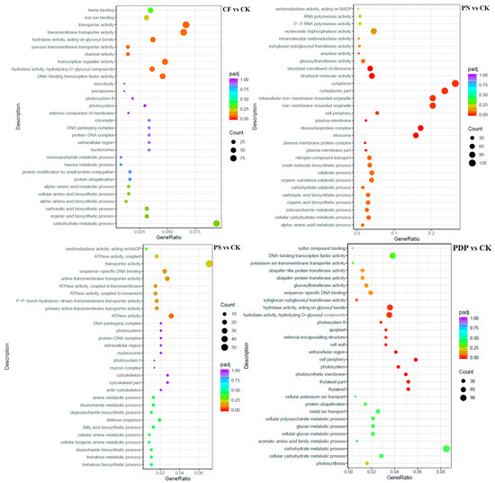 GO enrichment analysis of DEGs at 28 days after treatment. CK = control; CF = complex fertilizer; PN = potassium nitrate; PS = potassium sulfate; PDP = potassium dihydrogen phosphate.