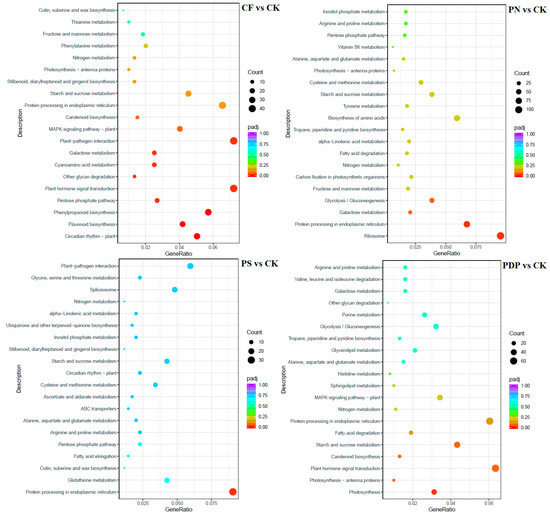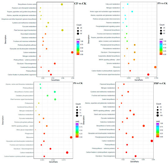 KEGG enrichment analysis of DEGs at 42 days after treatment. CK = control; CF = complex fertilizer; PN = potassium nitrate; PS = potassium sulfate; PDP = potassium dihydrogen phosphate.