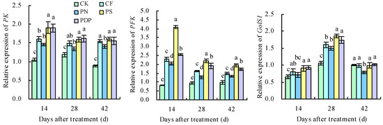 Fruit sugar and organic acid metabolism are regulated by multiple genes, and the genes in these metabolic pathways are usually regulated in a coordinated fashion [42,43]. Potassium promotes sugar accumulation and storage in fruits by upregulating the expression levels of genes related to the glycolysis and fructose metabolism pathways. PK is the rate-limiting enzyme in glycolysis and regulates C/N metabolism [44]. PFK is also one of the key enzymes in the glycolysis process [14]. In this study, the expression levels of PFK and PK were upregulated on the 14th, 28th, and 42nd days after treatment, and PFK and PK were enriched in the glycolysis and gluconeogenesis pathways and the fructose and mannose metabolism pathways, thereby suggesting that 6-phospho-fructose and phosphoenolpyruvate are being metabolized.