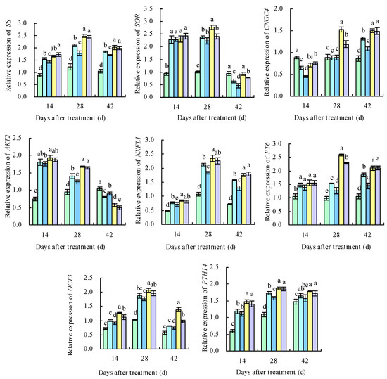 The 11 DEGs related to sugar metabolism and potassium transport were successfully verified with qRT-PCR (Figure 15). Throughout the three developmental periods of the grape berries, the expression levels of the DEGs related to potassium transport protein biosynthesis and sugar metabolism were increasingly upregulated, suggesting that applying potassium-containing fertilizers promoted the accumulation of potassium ions and sugar in the grape berries. The upregulated expression levels of PK, PFK, GolS1, SS, and PHT14 promoted the accumulation and transport of soluble sugars on the 14th, 28th, and 42nd days after treatment. The expression levels of SOR, AKT2, and OCT3 were higher than in CK on the 14th and 28th days after treatment, and those of CNGC4, NFXL1, and PT6 were higher than in CK on the 28th and 42nd days after treatment. The highest expression levels of these genes were observed in PS, followed by PDP. The expression levels of PT6 were higher than in CK on the 14th, 28th, and 42nd days after treatment, with PS and PDP being the highest. The expression levels of SOR in the four treatments were higher than in CK on the 14th and 28th days after treatment and lower than in CK on the 42nd day after treatment.