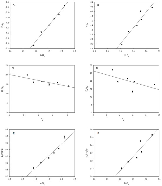Isotherm analysis (A,B) Freundlich model; (C,D) Langmuir model; (E,F) Tempkin model for Furosemide (A,C,E) and Hydrochlorothiazide (B,D,F) by β−CDs−EPI polymer. N = 3. Black circles agree with the different concentrations of PhACs tested: 5.0 mg/L, 7.5 mg/L, 10 mg/L, 12.5 mg/L, 15 mg/L and, 20 mg/L.