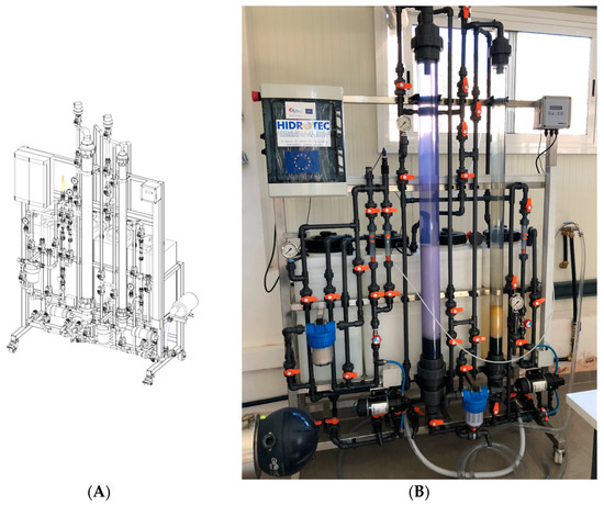 Image of the designed pilot-plant laboratory scale prototype (PPLSP). (A): Preliminary prototype drawing; (B): Full scale image of the built prototype.