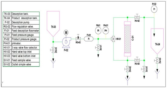 For desorption, the following additional elements: two new 50-L tanks TK-03 and TK-04; a self-priming polypropylene diaphragm pump P-02, an AISI 316 stainless steel needle valve RG-02; and one in-line flow meter FI-02, were included.