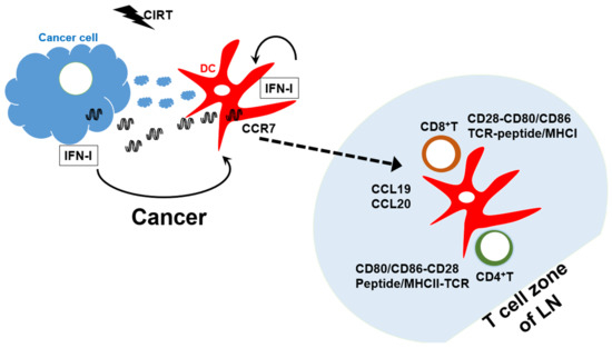 Carbon-ion irradiation insults cancer cells, which then activate anti-cancer adaptive immunity (Figure 2). As mentioned above, carbon ion-irradiated cancer cells undergo various biological processes. A high linear energy transfer of CIRT damages the cancer DNA into dsDNA breaks, causing more complicated DNA damage. DNA repair activation is likely insufficient to restore damaged DNA, resulting in the programmed cell death of cancer cells. Cancer cell fragments and particles are phagocytosed by phagocytes including immature DCs. Simultaneously, cancer cell-derived dsDNA activates the DC cGAS-STING axis to release IFN and other cytokines by activating the IRF1- and NF-κB-mediated signaling pathways, respectively [68]. In addition, immature DCs take up cancer cell-derived dsDNA, leading to the activation of their own cGAS-STING axis within immature DCs. In response to these cGAS-STING pathway-mediated cytokines, cancer cell fragments/particle-internalized immature DCs differentiate into mature DCs that express CD80 and CD86, as well as robust MHC class II, and exert cross-presentation activity. The internalized cancer cell fragments/particles are processed into peptides. Mature DCs present and complement these cancer-derived antigen peptides in association with MHC class II and class I molecules, respectively. Furthermore, mature DCs express chemokine (C-C motif) receptor 7 [95], which allows them to migrate into the T-cell zone of draining lymph nodes rich in chemokine (C-C motif) ligand 19 and CCL20, which are ligands of CCR7 [96]. Thus, in the T-cell zone, cancer-associated antigen-specific naïve CD8+ and CD4+ T cells are fully activated and become cytotoxic and effector cells, respectively. These activated lymphocytes egress the LN and enter the cancer, where they exert their anti-cancer functions.