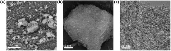 The successful preparation of PAF-54 was confirmed by FT-IR spectra and solid-state 13C NMR (Figure S1). No distinct diffraction peak in PXRD pattern (Figure S1c), indicating that PAF-54 is an amorphous network, possibly resulting from irreversible coupling reactions [30]. The irregular morphology of the prepared sample was characterized by SEM and TEM (Figure 1), which supported the amorphous nature of PAF-54, consistent with the PXRD results. PAF-54 is formed by the accumulation of complex sheet-like materials, which results in non-dense particles of varying sizes in the SEM images due to the disordered accumulation. The EDS analysis of PAF-54 is shown in Table S1, the PAF-54 skeleton contains up to 58.95% of elemental N, serving as the potential adsorption sites for Cr(VI).