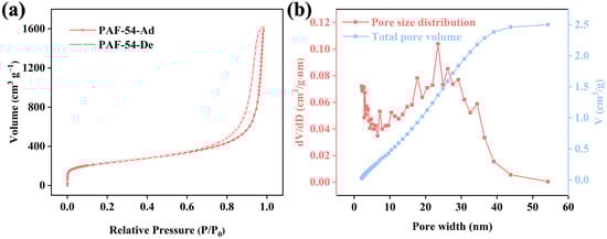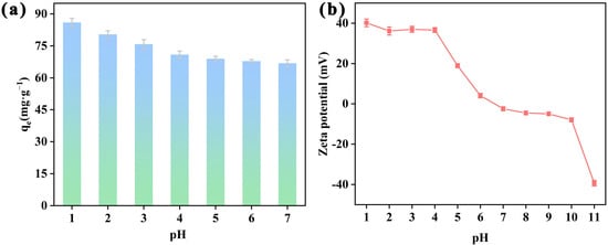 To study PAF-54’s performance for Cr(VI) adsorption, the adsorption behavior of PAF-54 under different pH conditions (1–7) was firstly investigated. The adsorption capacity of PAF-54 for Cr(VI) gradually increased as the pH decreased, reaching a maximum value of 87.16 mg/g at pH = 1 (Figure 3a). This can be attributed to the fact that Cr(VI) exists in various forms at different pH (Figure S2), including HCrO4−, Cr2O72− and CrO42−. HCrO4− are predominantly present at pH< 6.5, while CrO42− dominates at pH > 6.5 [31]. In addition, the pH of the solution not only changes the forms of heavy metal ions present in aqueous solution, but it also affects the protonation degree and surface charge of PAF-54 [32]. As shown in Figure 3b, at low pH (<7), protonation imparts a significant positive charge on the surface of PAF-54, thus enhancing the interaction with the anionic Cr(VI) and leading to improved adsorption capacity. And with a decrease in pH, the protonation capacity of PAF-54 was enhanced, boosting its adsorption capacity for Cr(VI) oxyanions. In order to simulate the strong acidic condition in electroplating wastewater, in the next series of adsorption experiments, the pH of the Cr(VI) solution was adjusted to 1.