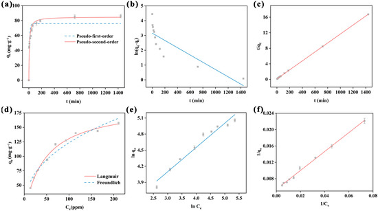 (a) Effect of adsorption time on adsorption capacity and the fitted plots obtained by (b) pseudo-first-order and (c) pseudo-second-order kinetic models. (m/V = 0.25 g/L, C0 = 75 mg/L, pH = 1) (d) Effect of equilibrium concentration of Cr(VI) solution on adsorption capacity and corresponding fitted plots obtained by (e) Langmuir, (f) Freundlich, (m/V = 0.25 g/L, C0 = 25-300 mg/L, pH = 1, t = 24 h).