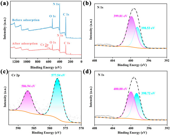 XPS spectra of the sample. (a) Survey spectrum of PAF-54 before adsorption and after adsorption; (c) Cr 2p of PAF-54 after adsorption; N 1s of PAF-54 (b) before adsorption and (d) after adsorption.