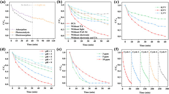 (a) Adsorption, electrosorption and photocatalysis of Cr(VI) by PAF-54@CP. ([Cr(VI)]0 = 10 ppm, V = 50 mL, pH = 1, E = 0.9 V, [TA] = 0.4 mmol/L) (b) The effect of TA, light, electronic and PAF-54 on Cr(VI) removal by PCS system. ([Cr(VI)]0 = 10 ppm, V = 50 mL, pH = 1, E = 0.9 V, [TA] = 0.4 mmol/L)The effect of (c) voltage ([Cr(VI)]0 = 10 ppm, V = 50 mL, pH = 1, [TA] = 0.4 mmol/L), (d) pH ([Cr(VI)]0 = 10 ppm, V = 50 mL, E = 0.9 V, [TA] = 0.4 mmol/L) and (e) Cr(VI) concentration (V = 50 mL, pH = 1, E = 0.9 V, [TA] = 0.4 mmol/L) on Cr(VI) removal. (f) Reusability test of PCS system. ([Cr(VI)]0 = 10 ppm, V = 50 mL, pH = 1, E = 0.9 V, [TA] = 0.4 mmol/L).