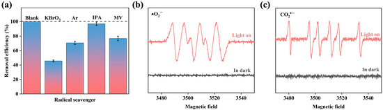 Photogenerated electrons can directly reduce Cr(VI), and other reactive radicals may also participate in the reaction. In order to explore the role of these active substances, scavenging experiments were performed using KBrO3, IPA and MV as e−, •OH and CO2•− scavengers, respectively (Figure 7a). And, argon was introduced into the solution during catalysis to remove oxygen to identify the effect of •O2−. As shown in the Figure 7a, the inhibition of Cr(VI) reduction was most obvious with the addition of KBrO3, and the removal effect could only reach 45.7%, indicating that e− plays a dominant role in this system. On the one hand, e− can directly reduce Cr(VI), and on the other hand, e− may generate •O2− with oxygen in the solution, and then further reduce Cr(VI). After passing argon to exclude oxygen, the Cr(VI) removal efficiency of the PCS system was significantly reduced, indicating that the •O2− did play a role in the photoreduction process, and the presence of •O2− was captured by ESR (Figure 7b). Similarly, free radical sacrifice experiments as well as ESR (Figure 7c) indicated that CO2•− radicals also played a larger role in the reaction process. It should be noted that CO2•− can be generated by TA after excitation by visible light [51]. This is probably because •OH is a common oxidizing agent and its effect on Cr(VI) reduction is almost negligible.