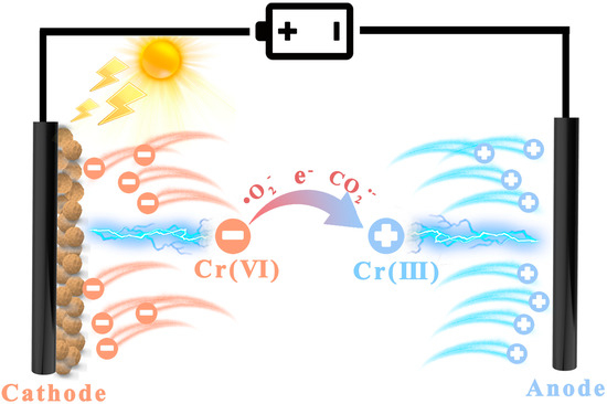 Capacitive deionization (CDI), a technique that enables ions in solution to move in a controlled manner, can realize the desired outcome [28]. Under the influence of the electric field, Cr(VI) oxyanions are enriched on the anode surface, while the reduced Cr(III) cations move away from the catalyst anode to vacate the reaction site. Thus, this technique may greatly enhance the photocatalytic mass transfer process as a way to improve the efficiency of Cr(VI) photoreduction.