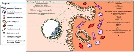 Summary of the molecular markers identifying embryo quality and the biochemical markers and molecular mediators associated to endometrial receptivity.