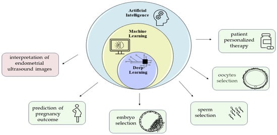 An expanding field of machine learning that has been increasingly used in recent years is artificial intelligence (AI). Thanks to specific algorithms and statistical analyses, AI is able to match different data and variables present in a database. AI is a powerful technological tool applicable in several fields, including ART. Indeed, AI can be applied to the evaluation of gametes to be used for in vitro fertilization. In this respect, specific algorithms have been developed for oocyte selection by integrating time-lapse data and gene expression or transcriptomic analysis in order to minimize the number of oocytes to be fertilized, avoiding the production of a surplus of cryopreserved embryos [,,,,]. AI has also been exploited for sperm selection, integrating data on motility, concentration, viability, and morphology [,]. In addition, AI has been recently used for assessing embryo viability, quality, and developmental stage (from cleavage stage embryo to blastocyst), in order to select the best embryo to transfer, vitrify, or biopsy [,,,]. Considering the significant correlation between blastocyst quality with euploidy and implantation, AI-powered time-lapse microscopy appears to be a promising non-invasive and non-static strategy for the morphological assessment of blastocysts. Indeed, AI would make it possible to eliminate high operator subjectivity, allowing a better evaluation of a dynamic and complex process that cannot be appreciated through static assessment [,,]. A further application of AI concerns its potential use in the design of therapeutic protocols. For example, AI has been proposed as a tool to identify the starting and total doses of FSH to be administered in order to maximize oocyte maturation, allowing the clinician to adopt a patient-personalized therapeutic approach.