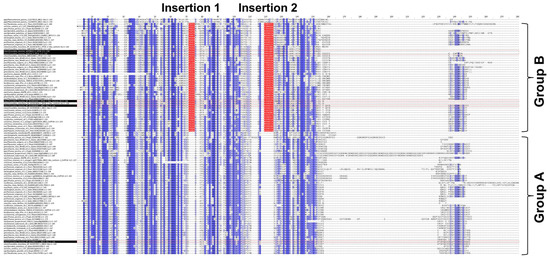 To unveil the differences between groups A and B, the multiple sequence alignment of the 104 PP16 ortholog sequences was analyzed. The analysis indicated that in group B, there were two insertions marked as red bars (Figure 3). Insertion 1 consists of four residues (consensus sequence: PGSX) and insertion 2 of six residues (consensus sequence: VE(N/K)G(X)(A/S/Y).