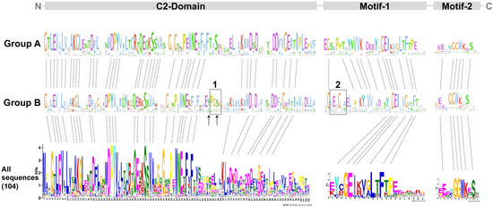 To determine the overall similarity as well as a motif/domain architecture of the PP16 proteins, common motifs were analyzed. First, potential common motifs were identified in the C2 domain using 104 sequences of the PP16 proteins. Second, motifs and domains found adjacent to the C2 domain were also searched. A consensus, represented as the logo of the C2 domain, has already been reported previously [14] and is available in the Kyoto Encyclopedia of Genes and Genomes (KEGG) database (https://www.genome.jp/tools/motif/; accessed on 22 November 2023). A list of the C2 domains present in each of the 104 sequences of PP16 peptides is shown in Table S2. Two non-redundant motifs were obtained in the C-terminus region of the proteins (motif 1 and motif 2; Figure 5). Likewise, the analysis of the domain architecture of the A and B groups resulted in only one common motif within the N-terminal of the C2 domain and two common motifs at the carboxy end. Despite the fact that the motifs in both groups displayed high similarity, there were some differences. There are two insertions (insertion 1 and insertion 2, black rectangle; Figure 5) in group B. Insertion 1 is in the C2 domain and insertion 2 is located adjacent to motif 1.