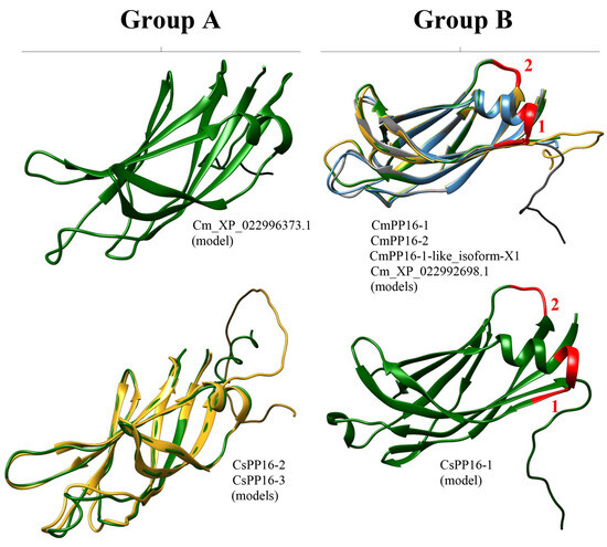 The crystal structure of most PP16 proteins has not been elucidated. Nevertheless, the 3D structure of the phloem protein 16-1 of A. thaliana (AtPP16-1) has been obtained through nuclear magnetic resonance (NMR) spectroscopy [22]. Thus, AtPP16-1 was used as a template model to predict the structure of PP16 homologs with the AlphaFold2 server. AtPP16-1 consists mostly of random coil-like disordered regions and overhanging side chains, except for three β-sheets and one α-helix. In addition, the N-terminal disordered regions of AtPP16-1 form a small lobe, which connects to the remaining protein region through an irregularly shaped cleft [22]. The results of this analysis showed that predicted structures of CmPP16-1, CmPP16-2, CmPP16-1-like_isoform-X1, Cm_XP_022992698.1_ERG1-like, and CsPP16-1 (group B) were composed of nine β-sheets and one α-helix (Figure 6). Similarly, Cm_XP_022996373.1, CsPP16-2, and CsPP16-3 (group A) predicted structures were composed of eight β-sheets and one α-helix shorter than the structures of group B (Figure 6).