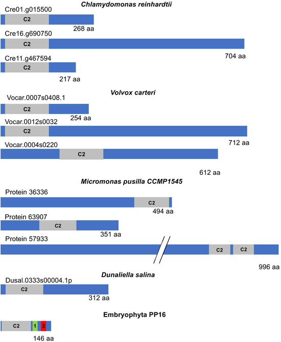 A more comprehensive analysis of the PP16 sequence and its closest counterpart in chlorophytes was conducted. A BLASTp was performed using the CmPP16 amino acid sequence as a query against the corresponding protein sequences in chlorophyte species reported in the Phytozome v13 database. While all the chlorophyte proteins showed similarity to synaptotagmins, which are involved in tethering opposing membranes for vesicular fusion [23], not all of them appeared to be functional homologs. Furthermore, the localization of the C2 domain within the chlorophyte sequences varied widely. In some cases, it was found in the N domain, while in others, it was located at the C-end or in the central region (Figure 7).