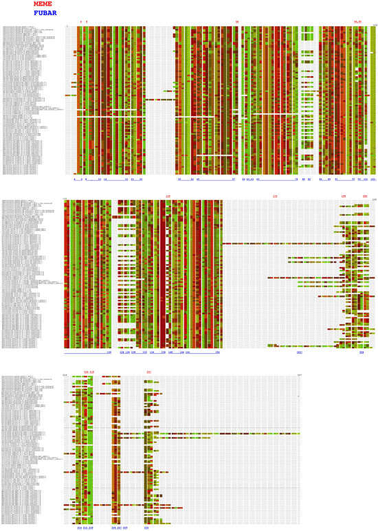 To detect if positive selection of the PP16 gene had an impact on its evolution, an analysis of this dataset was performed using the branch-site unrestricted statistical test for episodic diversification (BUSTED) method in the Datamonkey server. The BUSTED method allows us to test whether a gene has experienced positive selection in at least one site per branch or in the entire phylogenetic tree. On the other hand, to detect positive selection in specific sites, the mixed-effects model of evolution (MEME) and the fast, unconstrained Bayesian approximation (FUBAR) methods of the Datamonkey server were used. The results of the BUSTED method indicated that based on the likelihood ratio test, there is evidence of episodic diversifying selection or positive diversifying selection in the dataset analyzed, with p equal to 0.000007451 (http://datamonkey.org/busted/652eac01353125059b663a27). On the other hand, the result of the MEME algorithm indicated that there are twelve sites of episodic positive/diversifying selection (6, 8, 58, 98, 99, 139, 175, 198, 205, 216, 218, and 237) with a p-value threshold of 0.05 (Figure 8, red color font, http://datamonkey.org/meme/652e7173353125059b6635a1). In addition, the results of the FUBAR analysis indicated that there is only 1 site of pervasive positive/diversifying selection (183) and 128 sites of pervasive negative/purifying selection with a posterior probability of 0.9 (Figure 8, blue color font, http://datamonkey.org/fubar/652e9572353125059b663956).