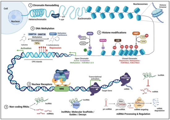 Levels of epigenetic regulation—Chromatin remodeling complexes such as SWI/SNF (switch/sucrose non-fermenting) complexes Histone post translational modifications mediated by histone methyltransferases (HMTs), histone acetyltransferases (HATs), and histone deacetylases (HDACs) DNA methylation catalyzed by DNA methyltransferase enzymes (DNMTs), nuclear receptors (NRs), and noncoding RNAs such as long non-coding RNAs (lncRNAs) and microRNAs (miRNAs) modulate transcriptional activity of the genome. The details of specific processes are elaborated in the text. SAM: S-adenosyl-methionine; LSD: Lysine specific demethylase 1; TET: ten-eleven translocation methyl cytosine dioxygenases; CPG: 5′-CpG-3′ dinucleotides; NRE: Nuclear Receptor Response Element. Symbols: Me: Methylation; Ac: Acetylation; The red circle and lines on CPG islands denote Methylation. The figure was generated using Biorender.com.