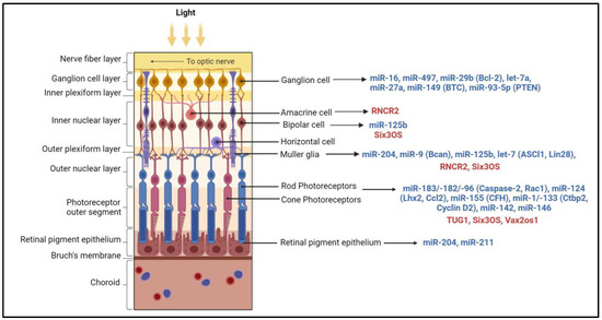 Non-coding RNAs associated with different retinal cell types. The miRNAs (in blue) with increased expression in various retinal cell types and their validated targets are shown in parentheses. The lncRNAs (in red) such as Six3 Opposite Strand (Six3OS), Taurine Upregulated Gene 1 (TUG1), retinal non-coding RNA4 (RNCR4), and Vax2os (ventral anterior homeobox 2, opposite strand) highly expressed in each retinal cell type are indicated. Bcl-2: B-cell lymphoma 2; BTC: betacellulin; PTEN: phosphatase and tensin homologue; Rac: Rac (the Ras-related C3 botulinum toxin substrate); Bcan: brevican proteoglycan; ASCL1: achaete-scute homolog 1; Lhx2: LIM homeobox protein 2; CCL2: C-C Motif Chemokine Ligand 2; CFH: complement factor H; Ctbp2: C-terminal-binding protein 2. The figure was generated using Biorender.com.