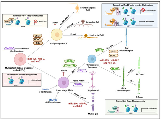 Epigenetic regulation during retinal development—Baf60c maintains the retinal progenitor cells (RPCs) in a proliferative state during development of the retina due to the activation of Notch signaling. The pluripotent genes are silenced during the differentiation of RPCs by histone deacetylation mediated by LSD1 and histone deacetylase 1 (HDAC1) and the repressive methylation of H3K9me2 by histone methyltransferase G9a. Dnmt1 facilitates the proliferation of late-stage retinal progenitor cells. HDAC1 facilitates the differentiation of RPCs by downregulating the multipotent genes. Various miRNAs involved in different stages of development are indicated in red. The nuclear hormone receptors that play specific roles during retinal development are indicated in green. LSD: lysine specific demethylase 1; BRG1: Brahma-related gene 1; Baf60c: BRG1/Brahma -associated factor; JMJD3: Jumonji domain-containing protein D3; Nrl: Neural retina leucine zipper; Brn3b: brain-specific homeobox/POU domain protein 3B; PROX1: prospero homeobox 1; COUP-TFs: chicken ovalbumin upstream promoter transcription factors; HES1: hairy and enhancer of split-1; OTX2: orthodenticle homeobox 2; SMAD7: Small Body Size (SMA) and Mothers Against Decapentaplegic family 7; TRβ2: thyroid hormone receptor β2; NR2E3: Nuclear Receptor Subfamily 2 Group E Member 3. The figure was generated using Biorender.com.