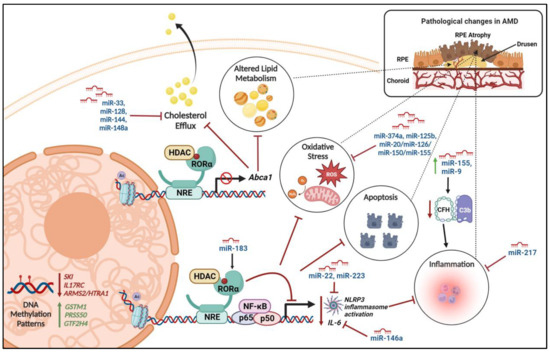 Nuclear receptor RORα regulates lipid and cholesterol metabolism [80] and pathways pertaining to lipoproteins, such as serum amyloid A and apolipoprotein A1 [81]. RORα was shown to regulate the expression of SIRT1 and, subsequently, affects deacetylation and nuclear translocation of NF-κB p65 and thereby inhibits the inflammatory response [82] (Figure 4). Ectopic expression of RORα modulates the inflammatory response by interfering with the NF-κB pathway and inhibits TNFα induced expression of IL-6, IL-8, and COX-2 [83]. This anti-inflammatory response and regulation of lipid homeostasis by RORα is mediated by direct interaction with the HDAC corepressor and subsequent suppression of target gene transcription (Figure 4) [84]. RORα SNPs rs4335725 and rs12900948 were shown to be associated with AMD [85]. The miR-183 cluster contains several binding sites for transcription factors such as RORα, indicating a potential for its transcriptional regulation [36]. Upregulated miRNA-9, miRNA-125b, miRNA146a, and miRNA-155 in the retina are associated with complement factor (CFH) deficiency, resulting in inflammatory degeneration in AMD [86]. Especially, miR-146a represses the expression of IL-6 and VEGF-A genes and inactivates the NF-κB signaling pathway in the RPE, which are key factors in the pathogenesis of AMD [87].