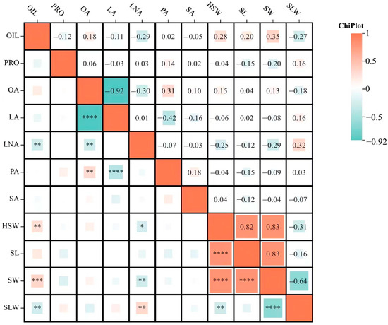 Correlation analysis of soybean protein, oil, and fatty acid components. (*, **, ***, ****) represent significance at the 0.05, 0.01, 0.001, and 0.0001 probability levels. The data in this table are the average results of the four environments.