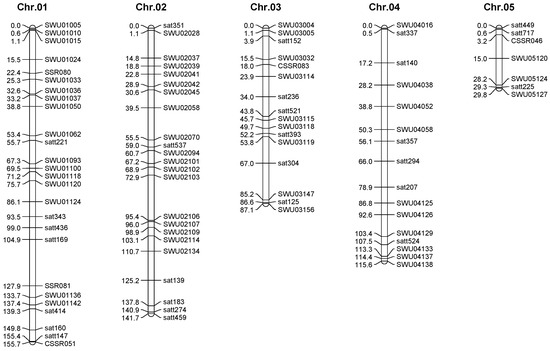 DNA extraction and SSR marker detection genomic DNA was extracted from young leaves collected from the F2 population of 186 single plants, two parent plants, and F1 plants [57]. A total of 3780 SSR primer pairs were synthesized by Biotech Bioengineering Co., Ltd., (Shanghai, China) derived from the soybean database SoyBase (http://www.soybase.org/, accessed on 7 January 2023) [58]. Some of these BARCSOYSSR primers were renamed as SWU in this study (as detailed in Supplementary Table S1). PCR amplification was performed as described by Zhang et al. [59]. Primers with polymorphisms between the two mapping parents were used to genotype the single plants of the F2 population. The band type identical to CJC2 was recorded as A, the band type identical to YSX2 was recorded as B, the heterozygous band type was recorded as H, and the deletion was recorded as U. The results were then gathered for further analysis. As a result, additive effects were defined for the CJC2 allele, which means positive genetic effects indicate that alleles of CJC2 increase phenotypic values.
