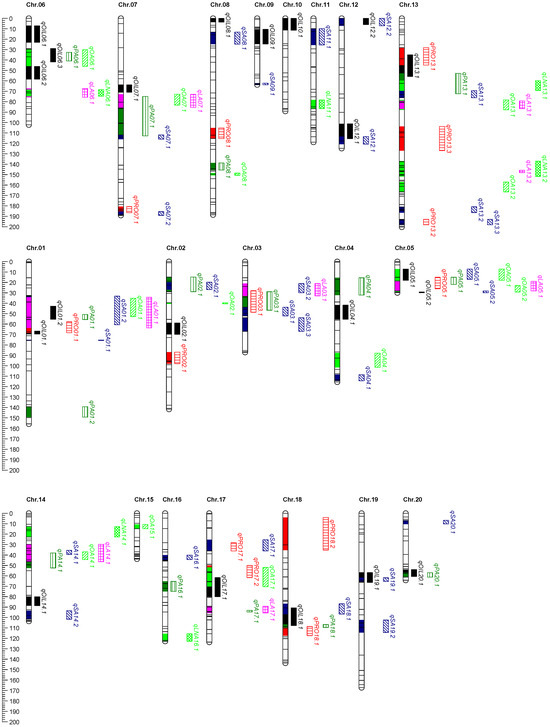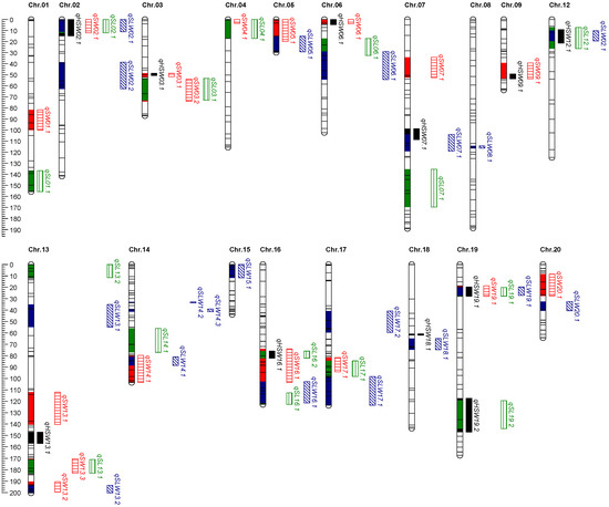 A QTL cluster is a densely populated QTL region of the chromosome which contains multiple QTLs associated with various traits [63]. All QTLs were sorted with the chromosome as the primary condition and the physical location as the secondary condition. QTLs with overlapping physical locations on the same chromosome were grouped into a cluster and identified as a QTL cluster if associated with at least two traits. The QTL clusters that we found were labeled with “Loci”. For example, for the QTL cluster denoted as Loci01.1, Loci indicates a QTL cluster, 01 indicates the chromosome on which the QTL cluster detected, and 01.1 indicates the order of the QTL cluster identified on the chromosome.