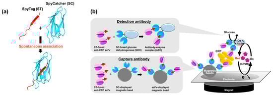 (a) An illustration of the association of SpyCatcher (SC) and SpyTag (ST). This was generated from a crystal structure of the SC/ST complex (PDB ID: 4MLI) using the PyMOL Molecular Graphic System, Version 2.5.2, Schrödinger, LLC. (b) A schematic illustration of electrochemical C-reactive protein (CRP) detection using anti-CRP single-chain variable fragment (scFv)-immobilized magnetic beads as a capture antibody and an antibody–enzyme complex (AEC) composed of anti-CRP scFvs and glucose dehydrogenase (GDH) as a detection antibody. The magnetic beads presenting anti-CRP scFvs and the AEC were prepared through the SC/ST reaction. mPMS, 1-methoxy PMS; Ox, oxidized form; Red, reduced form.