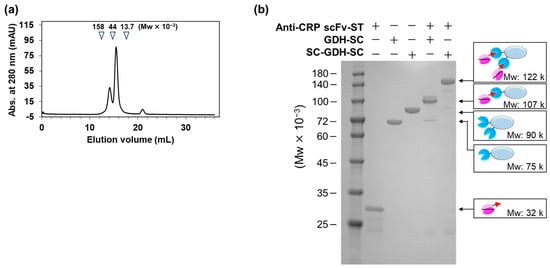 The preparation of anti-CRP scFv and the mono- and bivalent AECs. (a) A chromatogram after gel filtration chromatography for the purification of anti-CRP scFv-STs. The elution volume of each marker and its molecular size is shown above. (b) SDS-PAGE analysis of each sample for confirmation of AEC formation using the fractionated anti-CRP scFv-ST monomers. CRP, C-reactive protein; scFv, single-chain variable fragment; ST, SpyTag; SDS-PAGE, sodium dodecyl sulfate-polyacrylamide gel electrophoresis; AEC, antibody–enzyme complex.