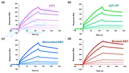 The affinity analysis of the prepared antibodies by surface plasmon resonance. The analyzed sensorgrams of (a) anti-CRP scFv, (b) anti-CRP scFv-ST, (c) the monovalent AEC, and (d) the bivalent AEC. The darker the color of each plot, the higher the concentration of each protein used for the analysis. The detailed concentrations used for the analysis are described in Materials and Methods. ScFv, single-chain variable fragment; AEC, antibody–enzyme complex; CRP, C-reactive protein.