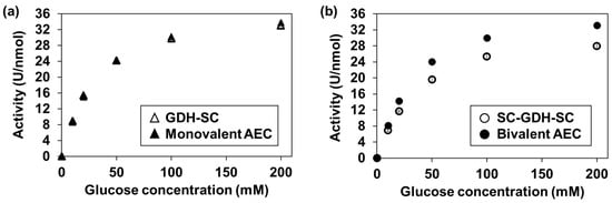 The GDH activity of the AECs was evaluated by calculating their specific activity (U/nmol). Here, one unit of specific activity was defined as the amount of enzyme that catalyzes the 1 µmol dichlorophenolindophenol (DCIP) reduction in one min at 25 °C []. As shown in Figure 4, an increase in the glucose concentration-dependent enzymatic activity was observed. The kinetic parameters were calculated from each curve and are summarized in Table 2. Neither parameter (KM nor Vmax) changed drastically after AEC formation, indicating the preparation of the bivalent AEC without a major loss of enzymatic activity.