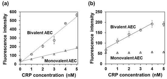 Because CRP is a homopentameric protein, CRP may be recognized by a single scFv clone as a capture and detection antibody in a sandwich ELISA []. Therefore, we immobilized anti-CRP scFv onto a 96-well plate and detected CRP using AECs with the same anti-CRP scFv clone. As shown in Figure 5b, the fluorescence intensity increased with CRP concentration when the bivalent AEC was used as the detection antibody. No signal increase was observed when the monovalent AEC was used as the detection antibody. These results clearly show that the bivalent AEC is a potential detection element for highly sensitive immunosensors when a single antibody scFv clone is used as the capture and detection antibody without employing IgGs.