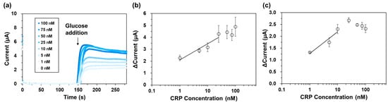Electrochemical CRP detection. (a) Chronoamperograms of each CRP concentration. Calibration curves of the electrochemical CRP detection (b) in the buffer and (c) in the human serum. Here, ΔCurrent was calculated from the equation, ΔCurrent = I + glu − I-glu. I + glu represents the response current value after glucose injection, and I-glu is before glucose injection. Data are shown as the mean ± S.D. (n = 3; R2 = 0.97 and 0.98 in the buffer and human serum, respectively). CRP, C-reactive protein.