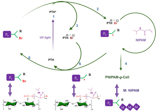 The synthesis mechanism of PNIPAM-g-Cell involves the following steps: (1) UV light excites PTH to form the excited-state PTH*; (2) the initiator (with Pn) reacts with the excited-state PTH*; (3) PTH* transfers electrons to Br, regenerating PTH*+; (4) the excited-state polymer initiator reacts with monomer NIPAM, leading to chain growth; (5) PTH returns to its ground state; (6) PTH*+ is deactivated but can be reactivated by PTH*.