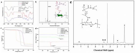 (a,c) FT-IR spectra (a), TG curves (c) of cellulose, cellulose–IBBr, and PNIPAM-g-Cell. (d) DTG curves of cellulose, cellulose–IBBr, PNIPAM-g-Cell, and PNIPAM. (b,e) 13C NMR spectrum (b), 1H NMR (e) of PNIPAM-g-Cell.
